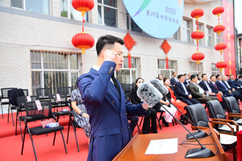 田径场内,红旗随风飘扬,激情澎湃,一片朝气蓬勃的景象。体育学院教师孙一雄代表裁判员、传媒学院2020级播音与主持艺术专业学生刘雅楠代表运动员庄严宣誓,分别表达了恪守原则、公正裁决的态度和奋勇争先、争创佳绩的决心,道出心中的热血与青春梦想。