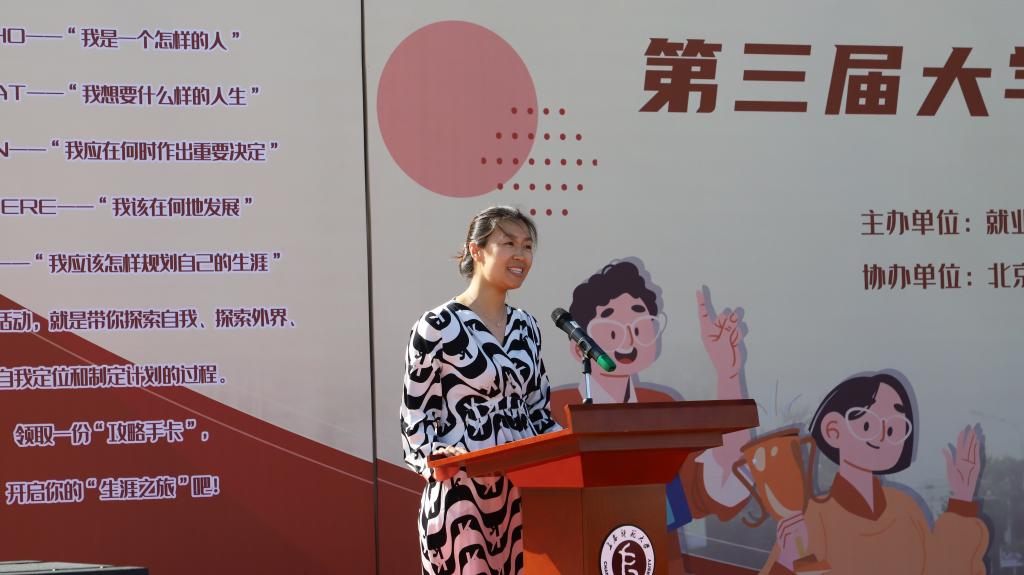 教师代表、国际教师教育学院教师张越分享了自己的工作经历和教学体验,并代表就业教育教师团队表达了做好就业指导服务的信心。