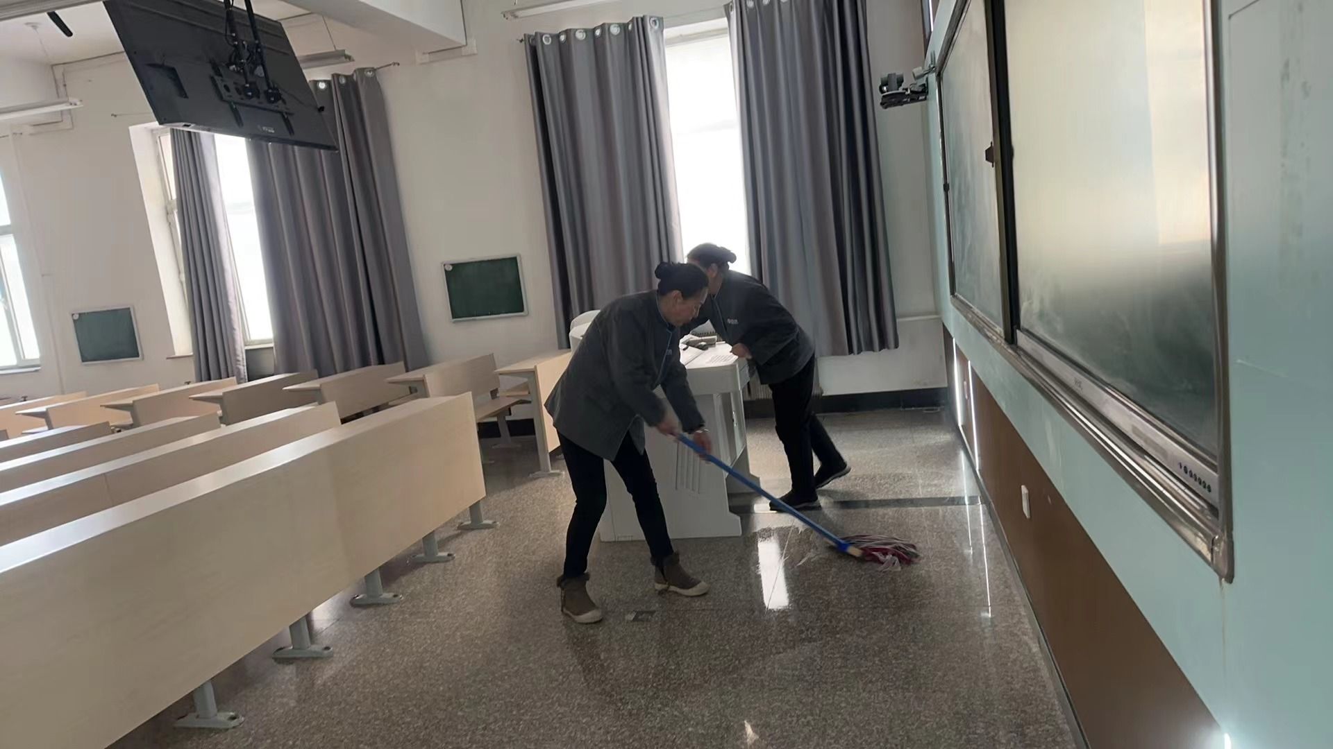 校园管理科张磊主要负责校园内的各类巡查检查,寒假一直没休息,每天在校园走走、看看,保洁有没有需要返工的地方,有没有危险的枯枝、冰溜子需要处理,他常说:“不看一眼,真的放心不下。”开学前,保洁工作提前启动,外保以路面、广场为重点,全方位清扫,集中力量清除积雪,对台阶处、斜坡路面的残冰,仔细清除,务必保证师生行路安全。内保以教室、卫生间为重点,全面开荒,清理卫生死角,以整洁的校园环境欢迎师生返校。