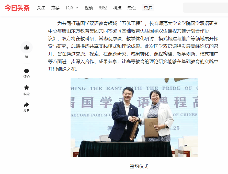 据悉,425日,在第二届国韵东方·经典传承——国学双语课程发展高峰论坛中,文学院与唐山东方教育集团共同签署《基础教育优质国学双语课程共建计划合作协议》,共同打造国学双语教育领域“五优工程”。双方将在教科研、常态观摩课、教学优化研讨、模式构建与推广等领域展开深入探索与研究,共享实践模式并高度提炼理论成果。