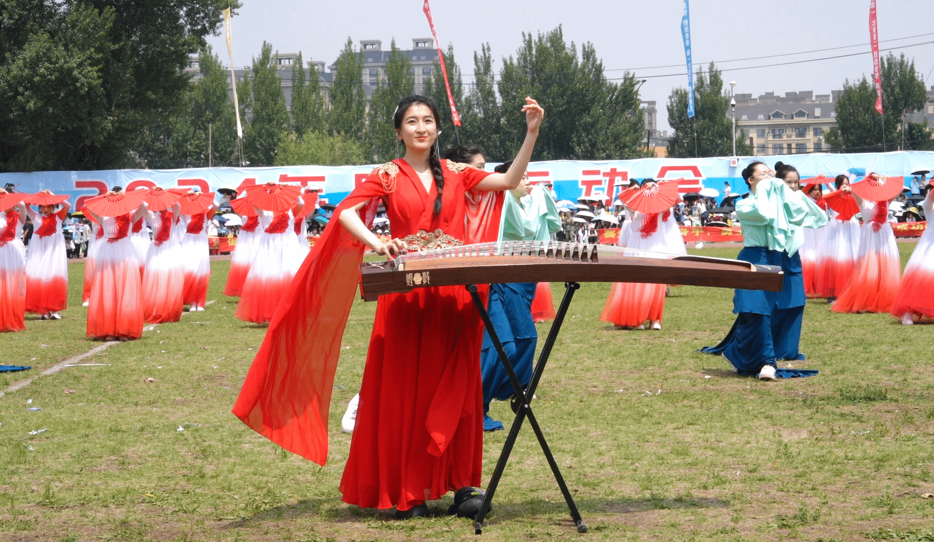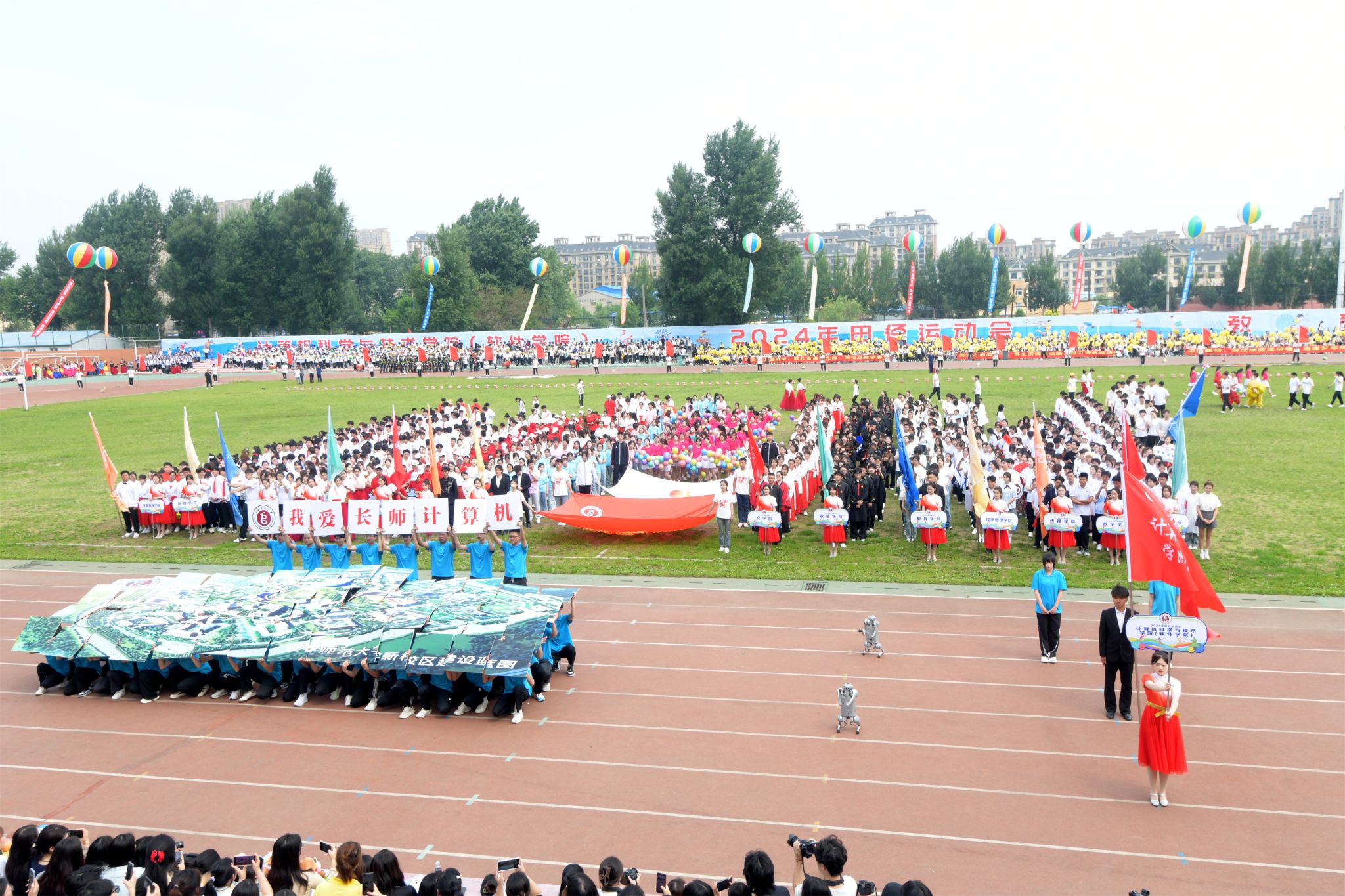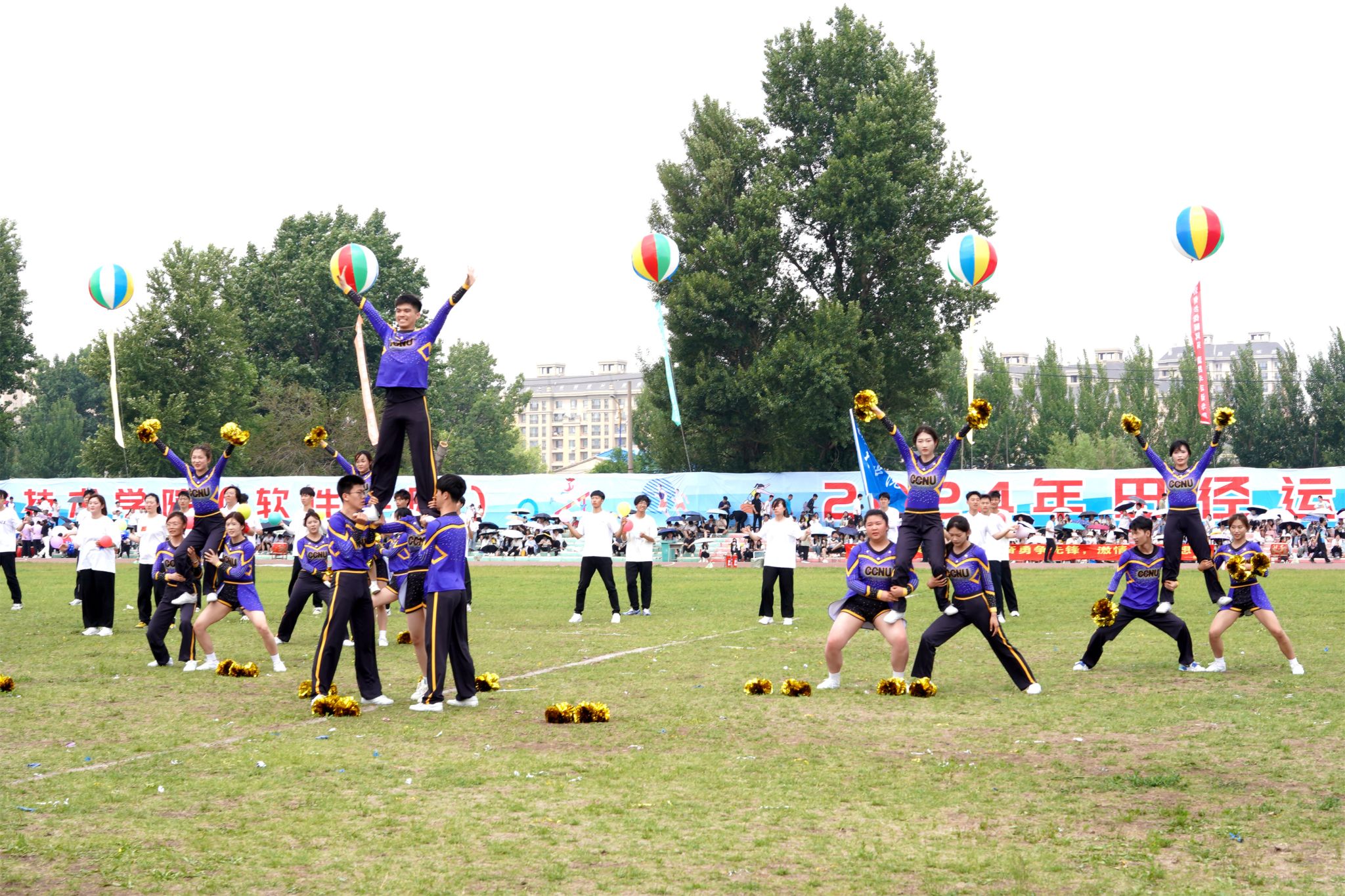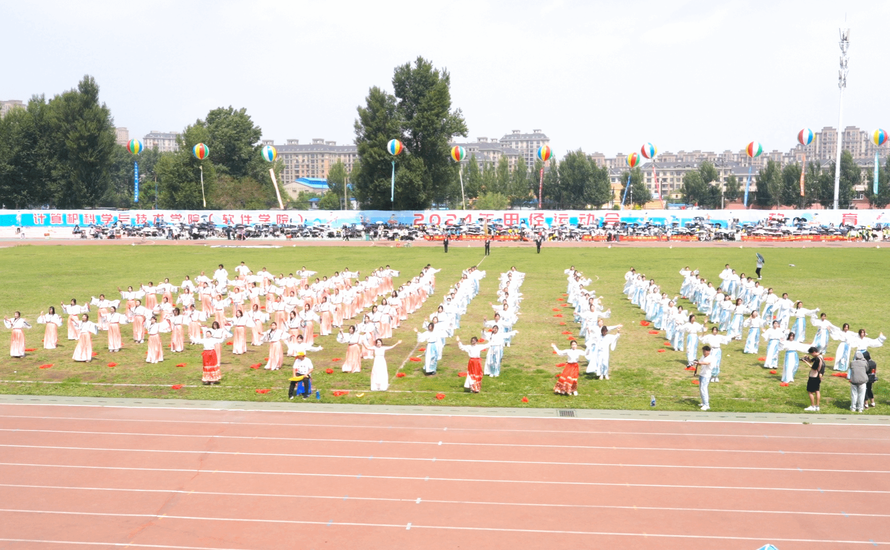 观众席上,旗帜挥舞,热情高涨的同学们为运动员的精彩表现欢呼喝彩,仿佛他们也是赛场的一部分。当运动员冲过终点或跃过横杆,爆发出热烈的掌声和欢呼为运动员的拼搏点赞。绿茵场中,律动优美的百人舞翩翩起舞,随着音乐节奏将每一个舞蹈动作做到与律动节拍完美融合,表达了长师学子对祖国的美好祝福及对未来的欣然向往。