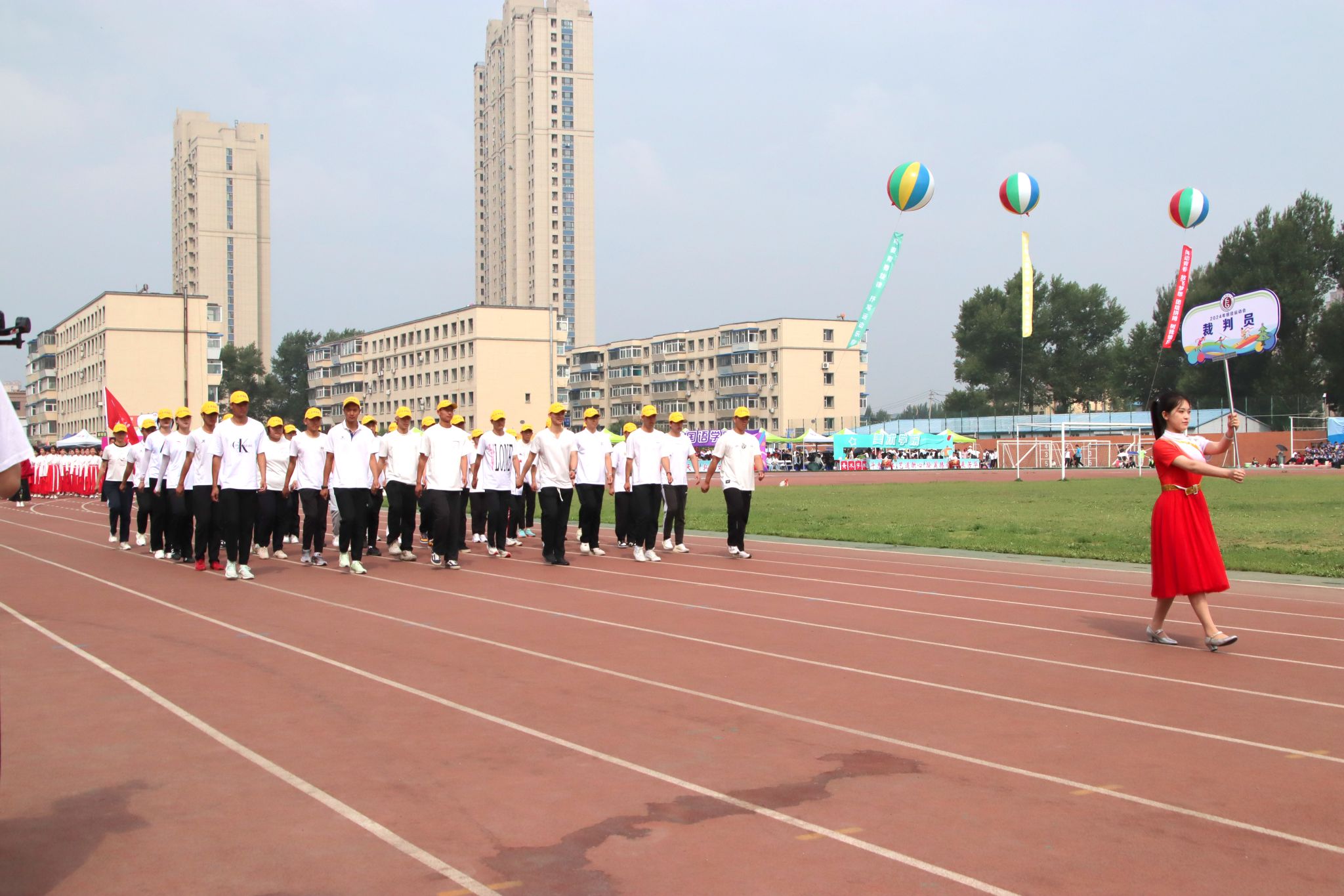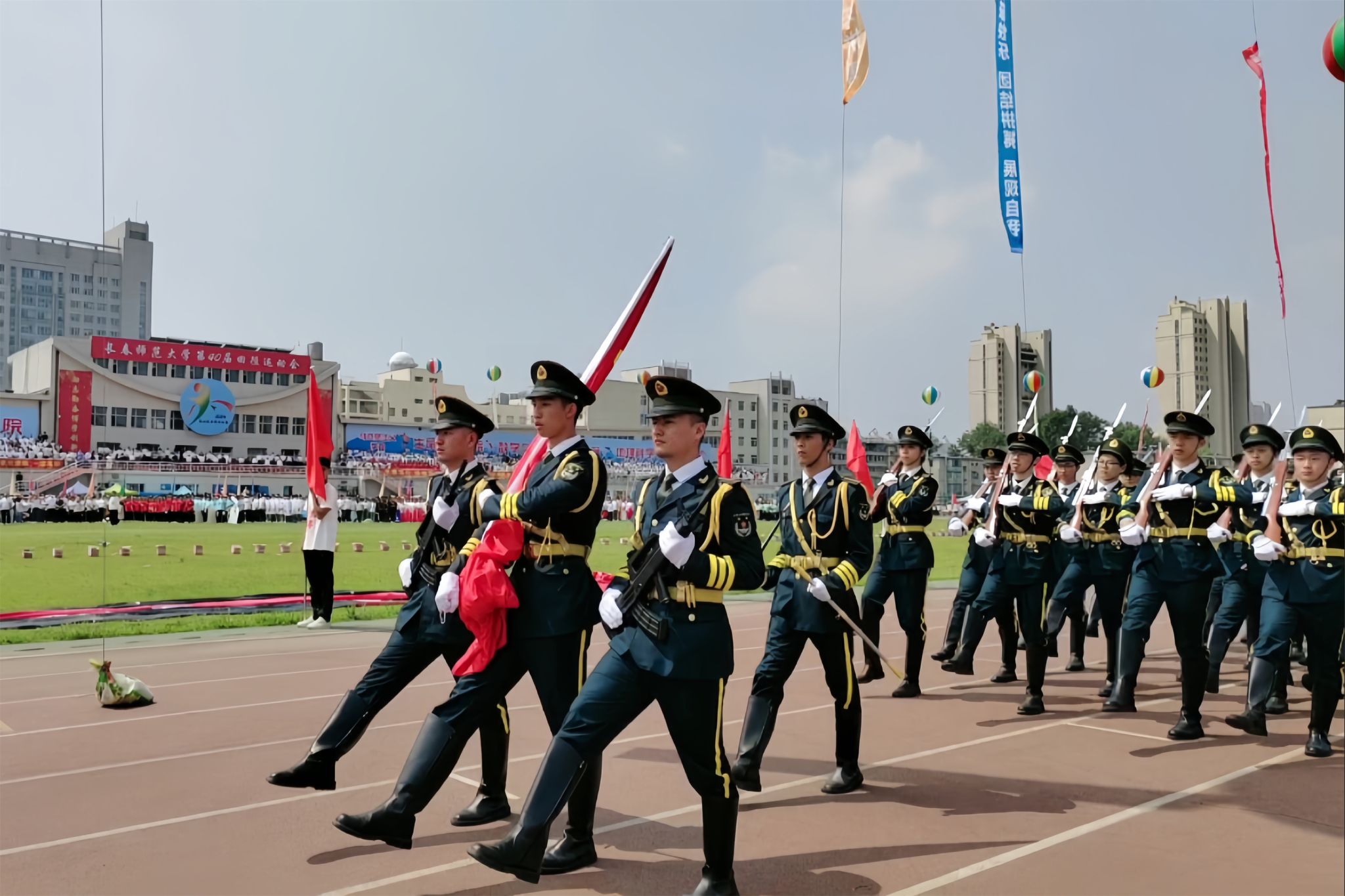 在庄严雄壮的国歌声中,五星红旗在田径场冉冉升起。