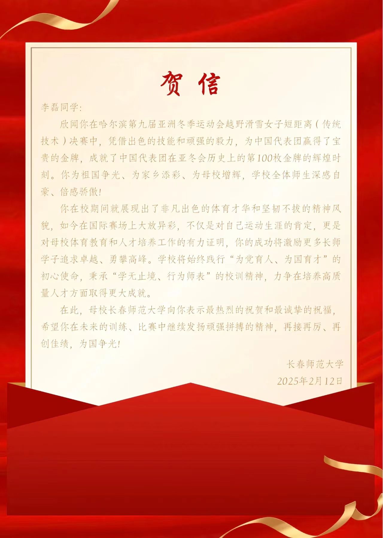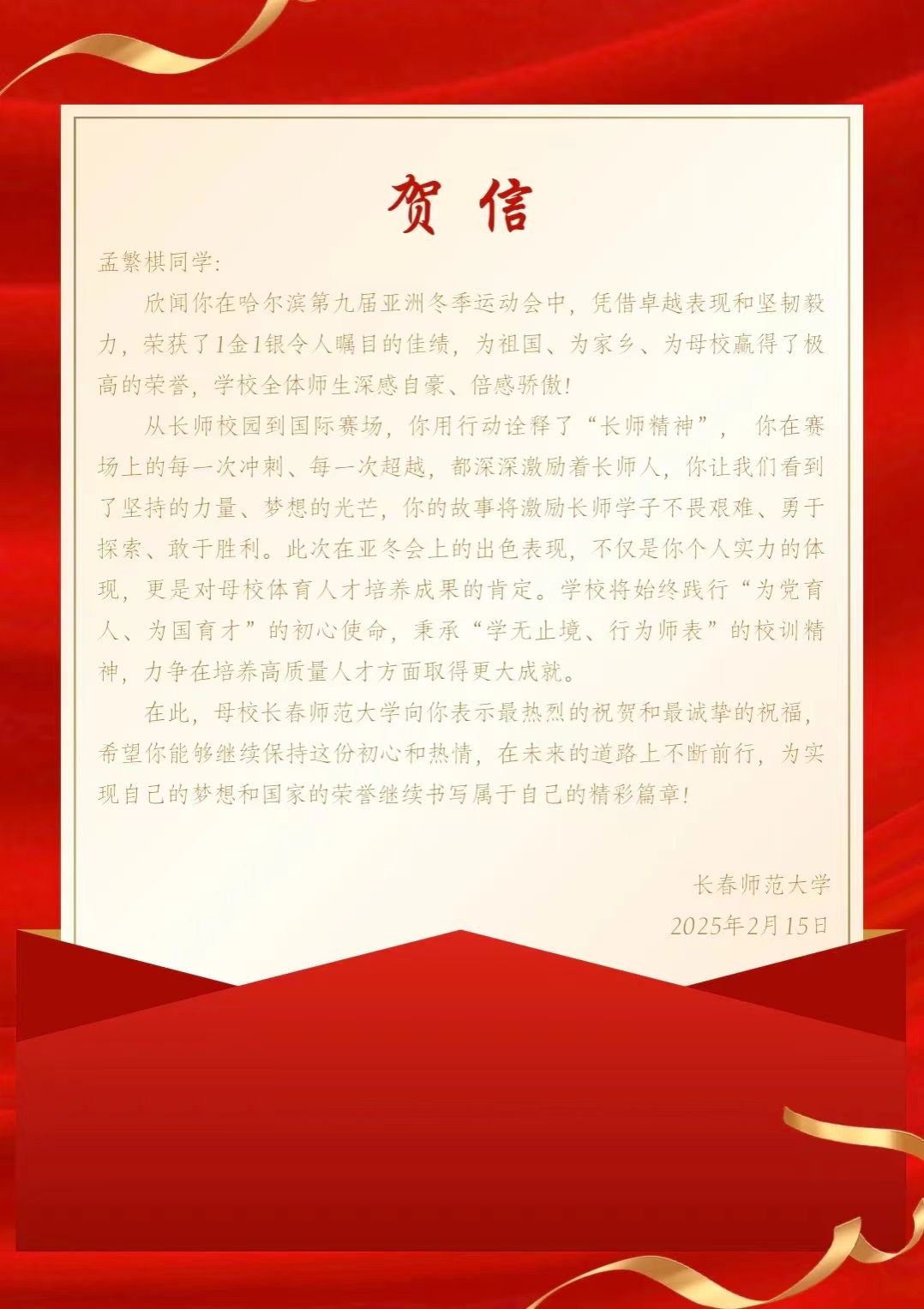 3名优秀的长师学子在亚冬会上为祖国、为家乡、为母校赢得了荣誉,学校全体师生为她们所取得的成就深感骄傲、倍感自豪,第一时间向她们发去贺信,表达最热烈的祝贺和最诚挚的祝福!